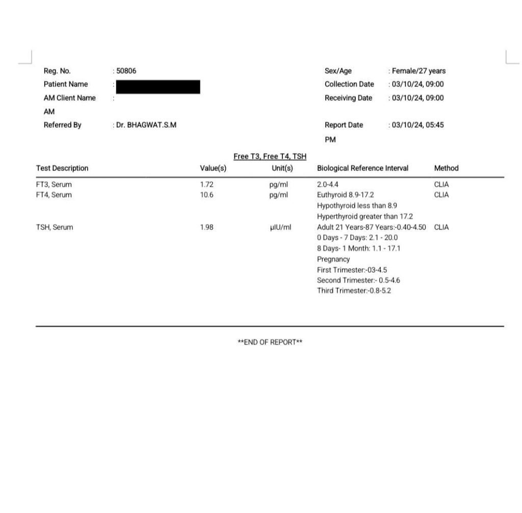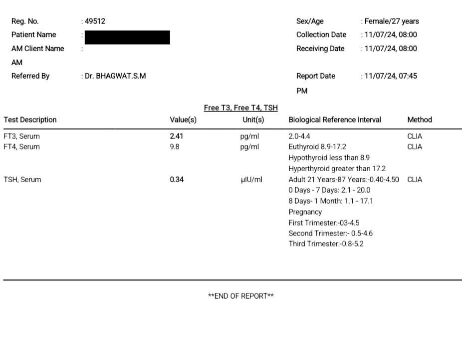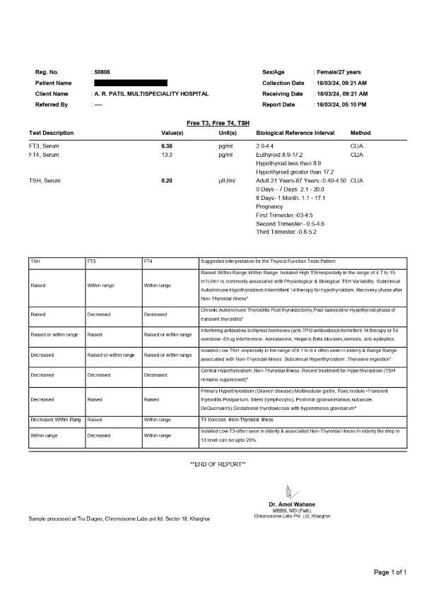 Thyroid profile and ultrasonography (abdomen and pelvis) was done by the patient. Where USG did not reveal any structural abnormality but, her thyroid profile was deranged FT3- 6.38pg/ml, FT4-13.3 g/ml, TSH- 0.20Iu/ml and the patient was diagnosed with Hyperthyroidis