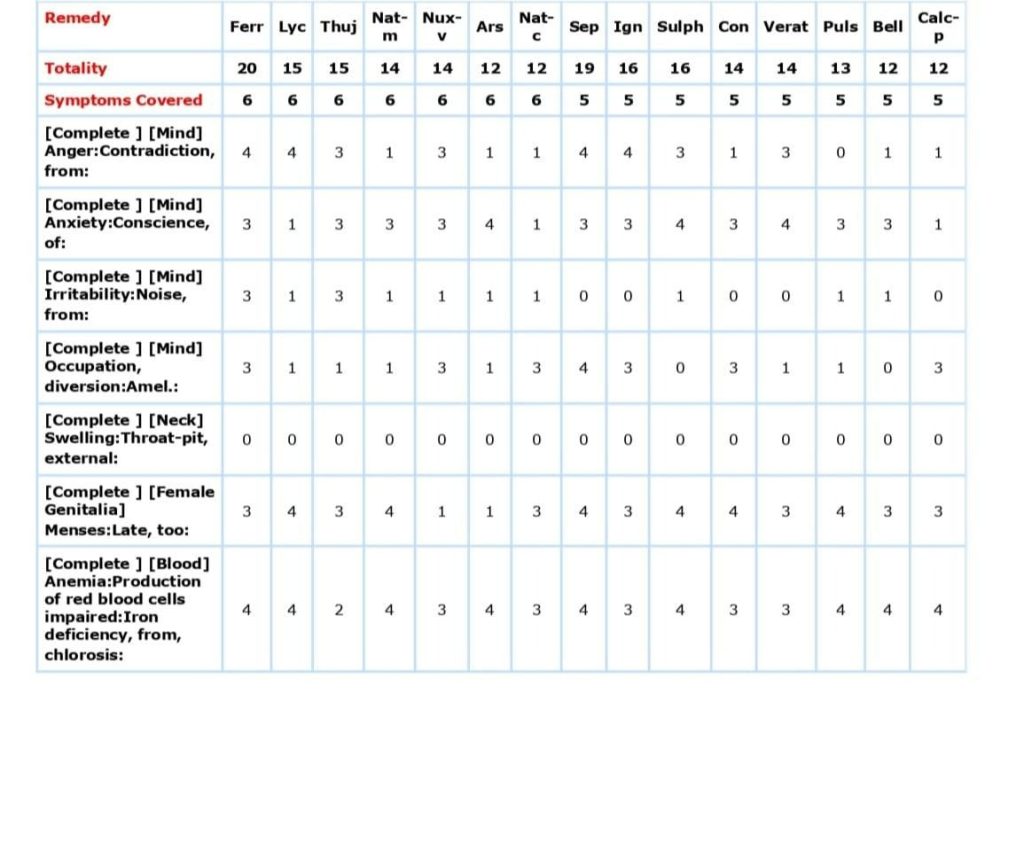After repertorisation with complete repertory, the top five remedies as per their hierarchy are as follows: