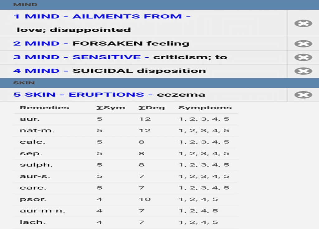 | 02/12/23(first visit) | Forsaken feeling, sensitive to criticism, disappointment in love, suicidal thoughts, suppressed emotions | Dryness of right breast, slight itching, occasional pain, hyperpigmentation | Case taken, totality formed | Natrum muriaticum 30, single dose & Placebo30/bd/15days |