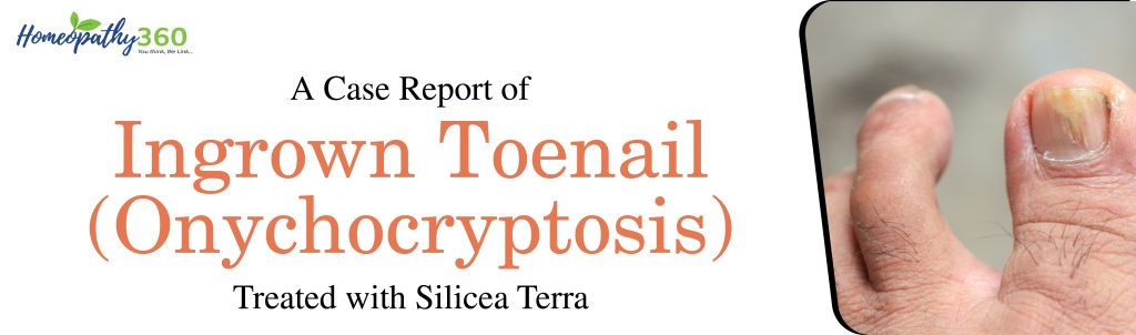 This case report illustrates a successful homeopathic approach to chronic ingrown toenail using Silicea terra supported by topical Calendula. The patient achieved complete healing within 6 months, avoiding surgery. Silicea’s known indications for nail involvement and Calendula’s antiseptic action(5) are consistent with the patient’s improvement. We suggest that homeopathic constitutional management can be considered in similar cases of onychocryptosis, particularly when patients seek a non-surgical option. Further studies would be valuable to corroborate these findings.