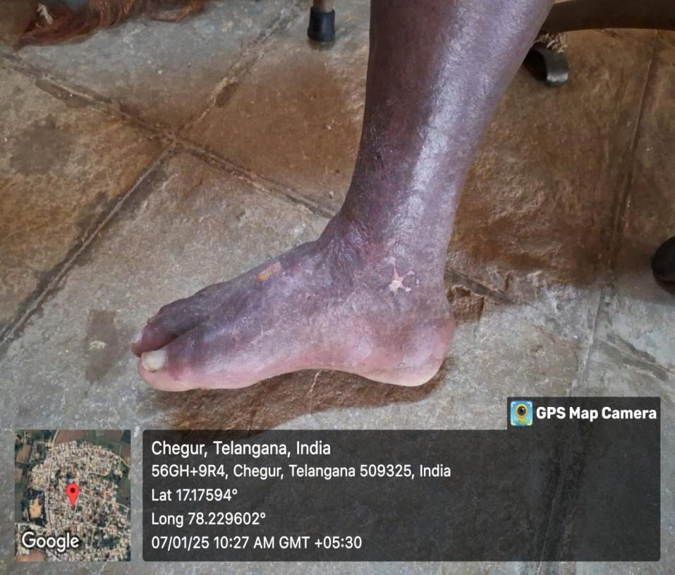 The patient developed gradual swelling of the right limb with discoloration and gradual progressing to ulcer formation over Right foot after Scratching and peeling of superficial layers of skin with oozing of watery discharge along with itching and numbness sensation in the whole limb, and no burning. Now using herbal medicines for one month with no significant relief.