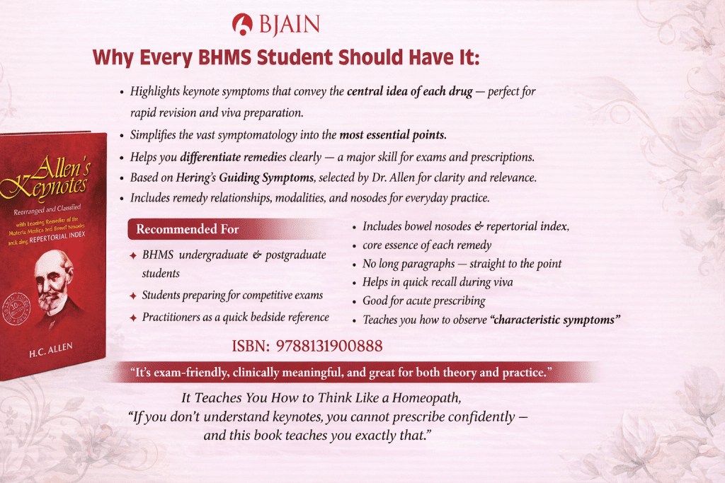 Interesting Fact- Allen’s keynotes book is entirely based on Hering’s Guiding Symptoms. For each drug, Allen selected some symptoms from “Guiding Symptoms” according to his sense of priority and his own personal experience. The remedy relationships in Allen’s “Keynotes’ ‘ are also based entirely on Hering`s Guiding symptoms.