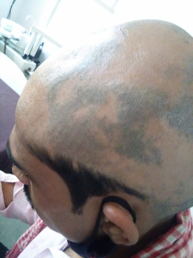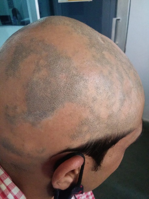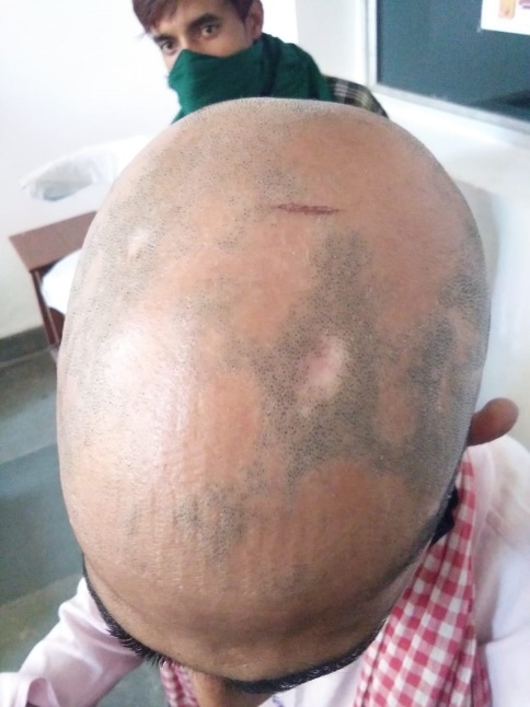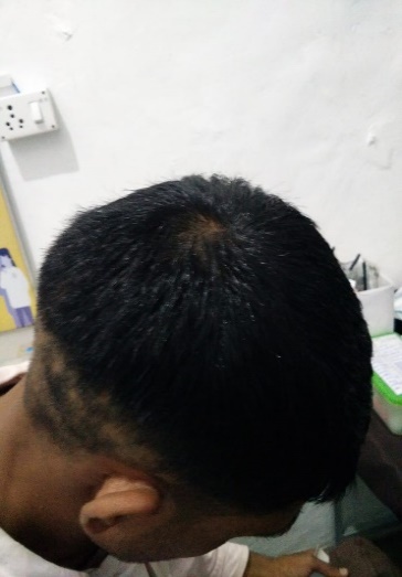 Patient was apparently well 1 year back when gradually, he experienced hairfall from certain areas of scalp, moustache and beard.