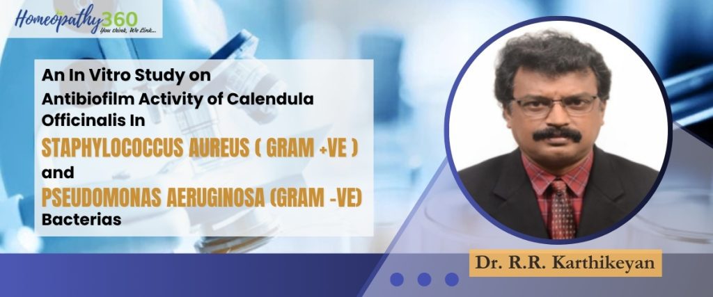 It has been proved that homoeopathic medicine Calendula officinalis possesses antibiofilm activity also. Moreover, it is also proved that Calendula officinalis tincture and Calendula officinalis 200C is more effective in inhibiting the biofilm growth and also plays an efficient role in eradication of biofilm produced by Staphylococcus aureus and Pseudomonas aeruginosa.