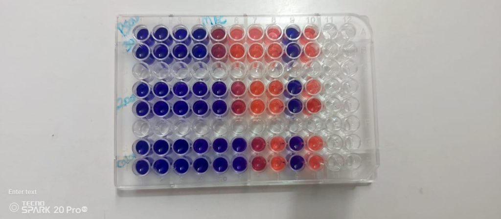 ProcedureThe minimum inhibitory concentration (MIC) is determined by the inhibitory effects of the selected homoeopathic medicine, for which 96 well plate assay is used. The homoeopathic medicine is added separately at different volumes to determine the MIC. This process is done individually for Calendula officinalis tincture, 30C and 200C, and also in comparison to Staphylococcus aures and Pseudomonas aeruginosa separately. Ampicillin is used as a positive control and sterile saline is taken as a negative control. Then, these are incubated for 48 hours at 37ºC. The optical density of bacterial growth is measured by Elisa Microplate Reader (LISA SCAN EM) to assess the antibiofilm activity. MIC was also visually determined as the lowest concentration at which bacterial growth was not observed by using the reagent RESAZURIN to indicate colour difference.