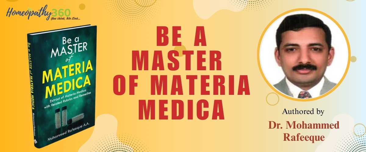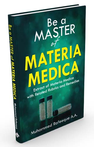 Dr. Muhammed Rafeeque's 'Be a Master of Materia Medica', a superb collection of symptoms & rubrics of an individual medicine, weaves these insights, among many others, into the fabric of what homeopathy is, how it works and what it means to be a homoeopath. In this book, well-proved drugs are selected and the symptoms are arranged in a systematic order - from generals to particulars. Under each symptom, the rubrical representation of the same symptom is given. Here the most suitable rubric is selected from a repertory in which the symptom is well represented. The remedies with gradings as given in the repertory follow the rubrics. This book makes the study of Materia Medica, comparative Materia Medica and Repertory easy and systematic. The readers will also get a chance to read the other indicated drugs for the same symptom. Since the grading is given, the intensity of each symptom in different drugs can be compared. The rubrics are selected from well-known repertories published by stalwarts like Kent, Knerr, Clark, Gentry, Boericke, Robert, Phatak and also from the latest repertories published by F. Schroyens and R. Murphy. In this book, the author has covered 86 well-proved drugs. On an average, the majority of the drugs carry 50 to 60 symptoms along with rubrics and remedies. Apart from improving the Materia medica knowledge, the routine use of this book can help the readers to get rid of “prejudiced materia medica,” which is the main reason for our failure in remedial diagnosis. Truly speaking, our mind is intruded with some specific drugs for each favorite “indication” we are habituated with. Here are some examples: · Most of us think about Lycopodium when the patient says that his complaint goes from right side to left! But, for the same indication, there are other drugs given in the repertories.