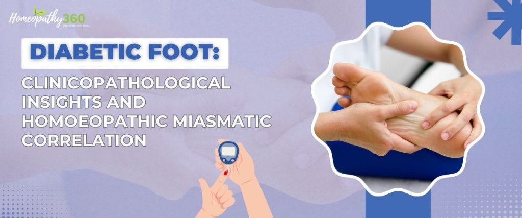 Diabetic foot is a severe and preventable complication of diabetes mellitus. Its pathogenesis involves neuropathy, ischemia, and infection, culminating in ulceration and gangrene. From a homoeopathic perspective, it represents a multi-miasmatic pathology with destructive syphilitic dominance in advanced stages. Comprehensive management requires early detection, metabolic control, wound care, and individualized constitutional treatment.