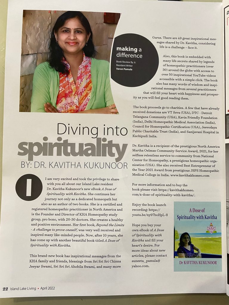 Launched her second book “A Dose of Spirituality with Kavitha” in January 2022. where all the proceeds of both books go to homeopathic /charitable organizations.
