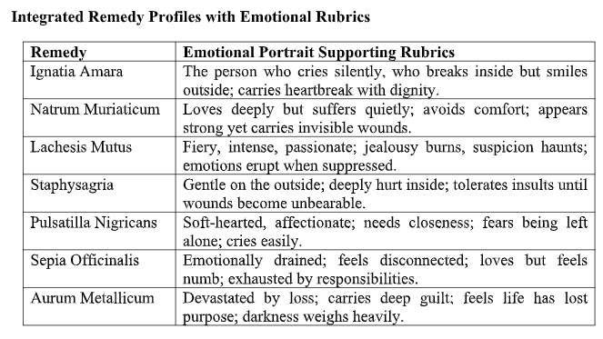 recognizes that grief, insecurity, and jealousy are not isolated events but interconnected disturbances revealing deeper internal disharmony. Healing must therefore embrace the entire emotional landscape, not just fragments of symptoms. This paper offers a compassionate and integrative view of relationship-induced emotional distress. By uniting modern psychological insights with homoeopathic principles—rubrics, miasms, and remedy profiles—it explores how individualized homoeopathic care can help people move from emotional chaos toward clarity, resilience, and renewed self-understanding.