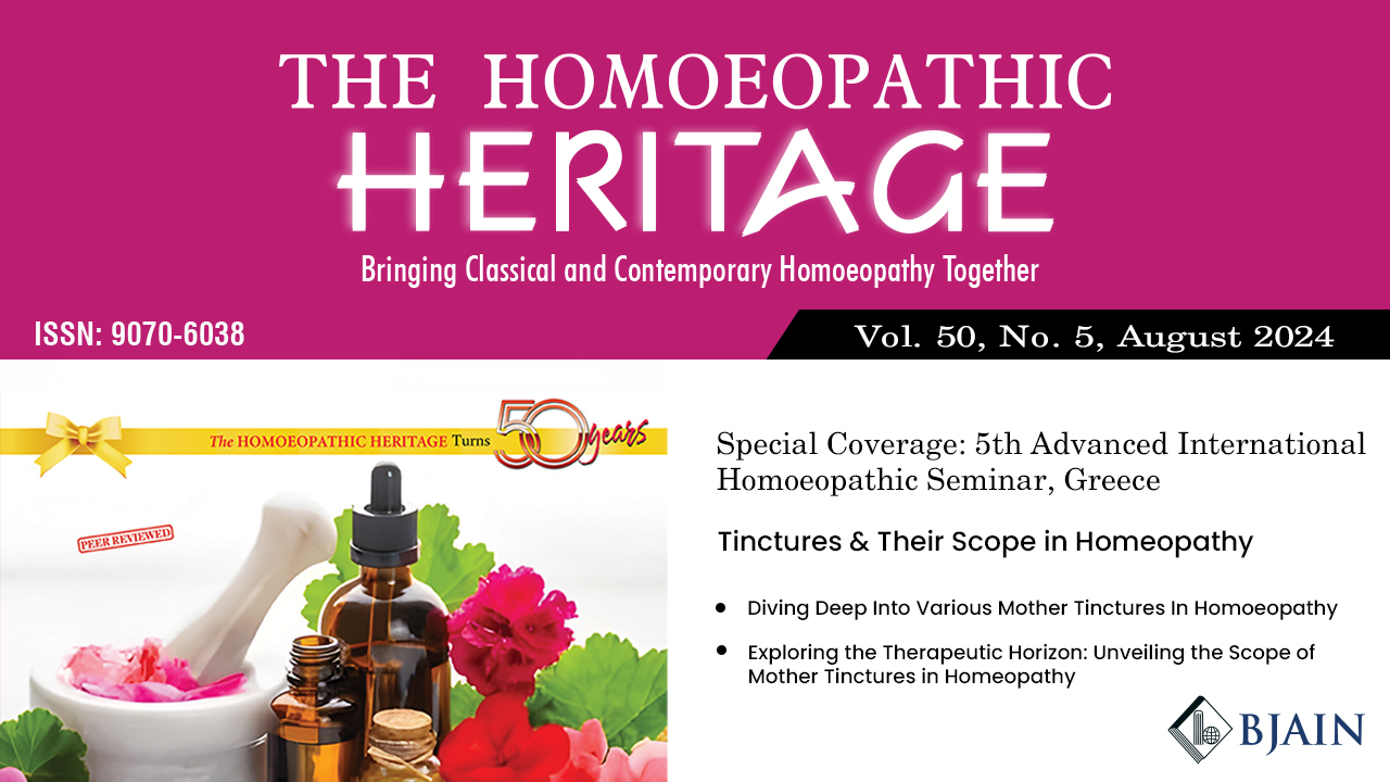 This issue of The Homoeopathic Heritage titled ‘Tinctures and Their Scope in Homoeopathy’ highlights the importance of mother tinctures- the very source of all other potencies of homeopathic medicines, in homoeopathic practice. The issue features Dr Harsh Nigam who elucidates us on the rationale behind using mother tinctures in modern homoeopathic practice followed by the section- ‘Stalwarts’ Expedition’ presenting to you the life of DR F. E. Gladwin, penned by Dr Subhas Singh. The column ‘In Italics’ of this issue gives its readers a sneak peak into the 5th Advanced International Homoeopathic Seminar held in Greek Island of Tinos, Greece in June this year. Besides these, we have research articles, opinion pieces, and case studies by various budding homeopaths, students and practitioners of Homoeopathy. This issue also enlightens its readers about three absolutely indispensable books- Healing Cancer: A Homoeopathic Approach by Dr Farokh J. Master, Mind Rubrics in Homoeopathic Prescription: Beginner Series Part: I by Dr Krishna Kumar Dinde, and Talks on classical homeopathy by George Vithoulkas through book reviews given by Dr. Garima Verma and Dr. Kirti Mishra; Dr Yogesh D. Niturkar and Dr Ayesha Naaz respectively.