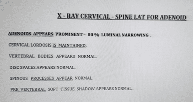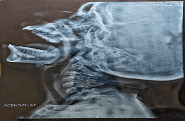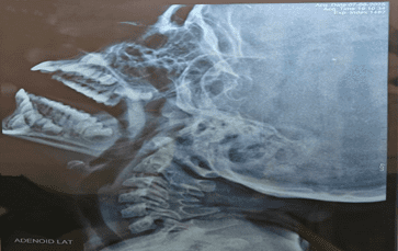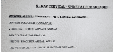 ESR  –  30 mm after 1 hr. Increased X – ray – Head-lateral view for Adenoid X – ray report – Adenoid appears prominent with 80 % luminal narrowing