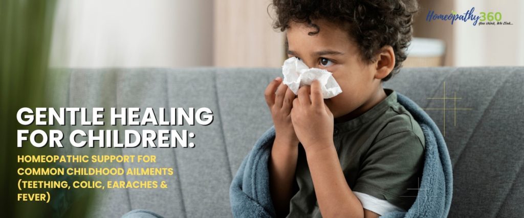 Homeopathy for children, teething remedies, colic relief, earache homeopathic treatment, childhood fever, pediatric homeopathy, natural healing for infants, gentle remedies, Chamomilla, Belladonna, Pulsatilla, Magnesia phosphorica, Aconite in children