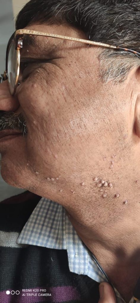 • Location: Scattered over the cheeks, neck and near the chin; 10–12 lesions, 2–4 mm in diameter, rough, slightly raised, flesh-coloured to light brown.