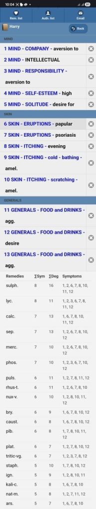 | 17/09/2025 | C/O itching and dryness of the whole body-Better C/o scaling of skin- reduced C/o reddish papular eruptions- betterC/o new reddish eruptions behind the ear and forehead- betterC/o dryness of back- betterBowel habit: betterAll other generals are good.O/E: reddish eruptions present on the trunk, bilateral limbs with discolouration.BP: 110/80; Weight: 95 kg | RxLYCO (0) 1P EMES2 GRAIN TABLET (2-2-2)5 GRAIN TABLET (1-0-0) EMES x3 WEEKS |