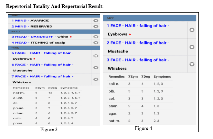 During the next follow-up, the patient presented with increased intensity of scalp itching and dandruff. The case was re-taken and re-analysed, Repertorised with synthesis repertory leading to the prescription of Phosphorus 200 (single dose) After two Months of treatment, improvement in the dandruff and scalp itching was observed, though the bald patches remained unchanged. On further analysis and repertorisation, Selenium was prescribed. After two Months of continued treatment, hair growth seen only on eyebrows. After two months complete regrowth of hair was observed on the eyebrows, moustache, and beard. This case exemplifies the effectiveness of Homoeopathic remedies in managing alopecia areata when applied with a personalized and holistic approach.