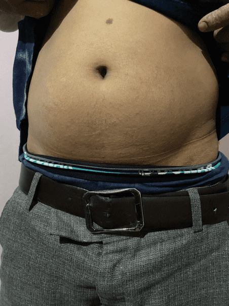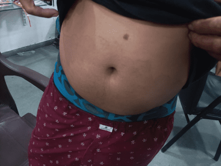 ∙ The patient had brownish-black patches over the abdomen, gradually spreading since 8 months. The discoloration became more evident after bathing and sweating.