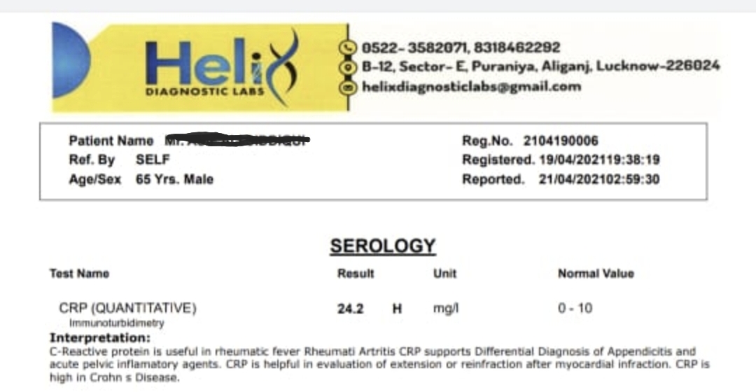 06-05-21 The patient reported much improvement. SpO2 was now stable at 95. Since appetite returned to normal and weakness was also better, China officinalis 30 was stopped. It was assumed the Phosphorus might also bring down the liver enzymes further. The following prescription was continued.   BLOOD (06-05-21): Creat-2.0, Urea-59, Na-139, K-4.0, SUA-5.3 RT-PCR SARS CoV-2RNA (06-05-21): Negative The blood reports of the patient showed improvement and it was necessary to bring down the creatinine even further. The patient had already taken 0/1 potency for 17 days, it was decided to continue with next potency. Therefore, Phosphorus 0/2 was given.[5] Phosphorus Q2. Continued 5 drops once every hour.
