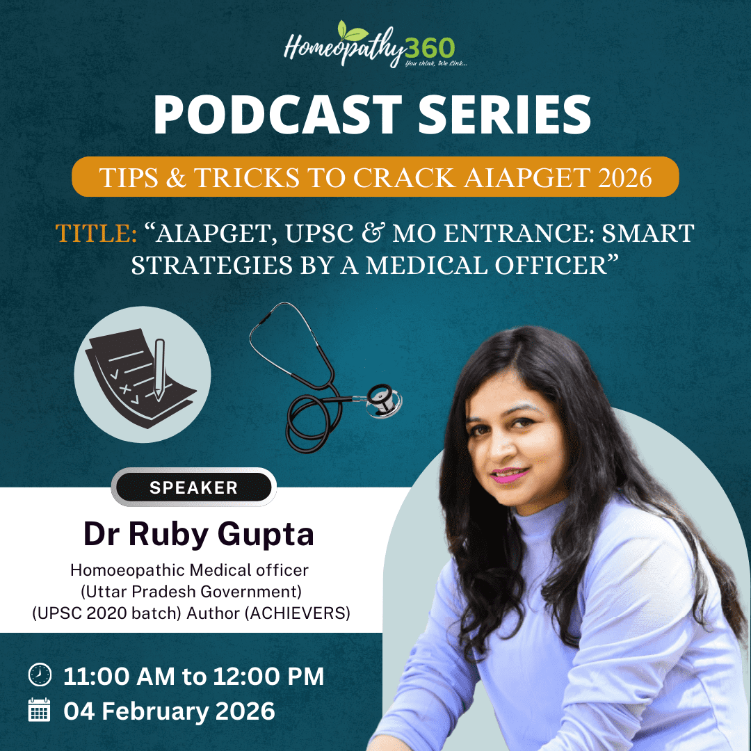 Join Homeopathy360’s Podcast Series “Tips & Tricks to Crack AIAPGET 2026” and learn smart strategies for AIAPGET, UPSC & MO Entrance from Dr Ruby Gupta (UP Govt Medical Officer, UPSC 2020 Batch, Author – ACHIEVERS). Get expert guidance, preparation tips, and motivation to boost your competitive exam success.