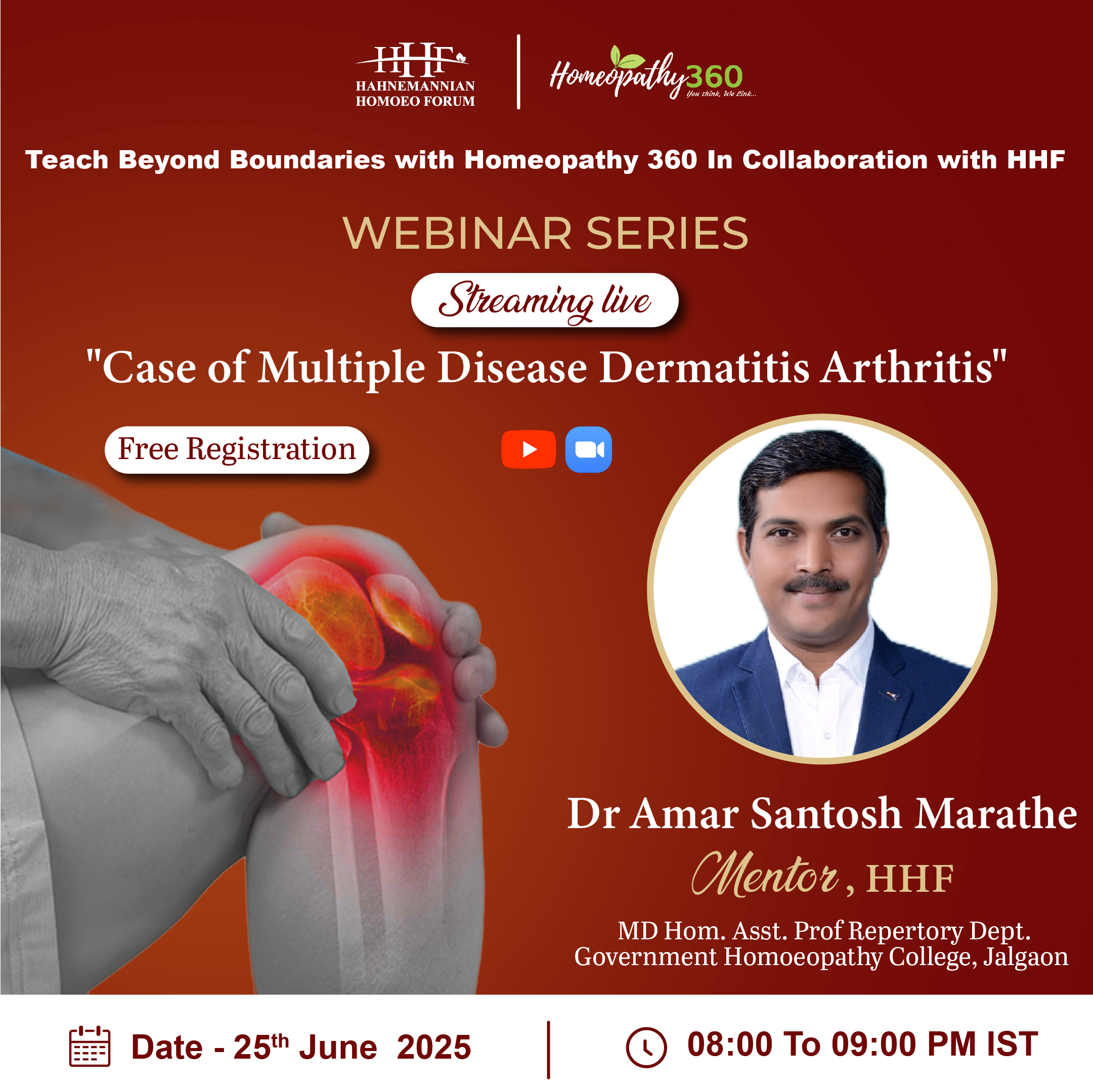 Join Upcoming webinar with Dr Amar Santosh Marathe (Mentor, HHF) “Teach Beyond Boundaries with Homeopathy 360 In Collaboration with HHF”Join us for an enriching live webinar with Dr Amar Santosh Marathe on “Case of Multiple Disease Dermatitis Arthritis”Title: “Case of Multiple Disease Dermatitis Arthritis”FREE REGISTRATION (Registration link): https://us06web.zoom.us/webinar/register/WN_0goHAyQXRnGNiRoPR96t7A Speaker: Dr Amar Santosh Marathe – MD Homoeopath and Assistant Professor Repertory Department in Government Homoeopathy College JalgaonSession date: 25 June 2025Timings: 08.00 PM to 09.00 PMKey Highlights of the WebinarLifesaving case suicidal thoughts due to disease conditionsModerator:Dr Mansi Tyagi – BHMS (SHMC, Delhi), DNHE, Marketing Head & Editor Homeopathy360About the Speaker: https://www.homeopathy360.com/dr-amar-santosh-marathe/ Webinar Video Post Views: 3,953
