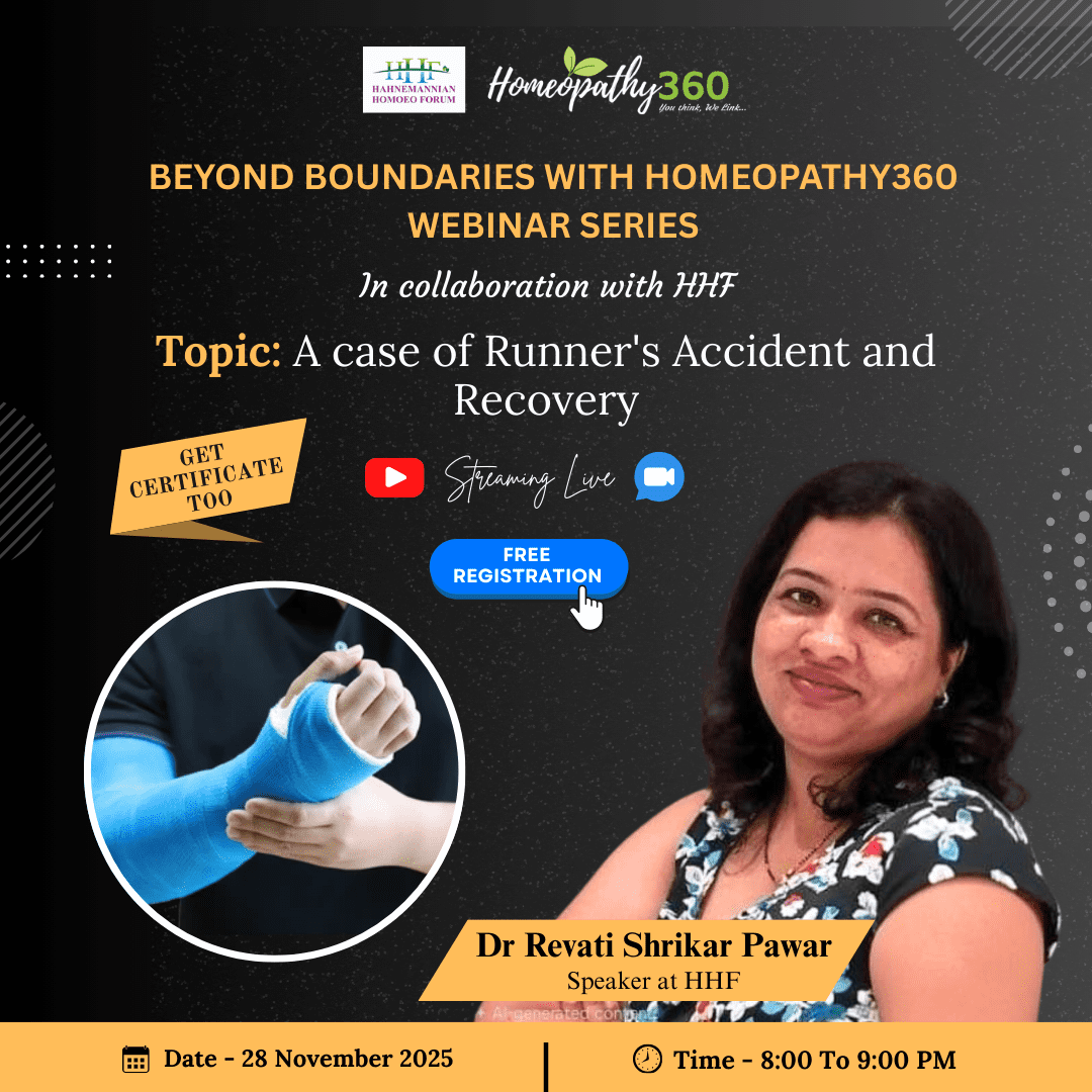 Join Upcoming Webinar with Dr Revati Shrikar Pawar “BEYOND BOUNDARIES WITH HOMEOPATHY 360″Join us for an enriching live webinar with Dr Revati Shrikar Pawar on “A case of Runner’s Accident and Recovery”Title: “A case of Runner’s Accident and Recovery ’’Speaker: Dr Revati Shrikar Pawar – BHMS, MCAH Dombivli, Maharashtra, India,Session date: 28th November 2025Timings: 08.00 PM to 09.00 PMFREE REGISTRATION (Registration link) : https://us06web.zoom.us/webinar/register/WN_J7nq-aKMR42Db2yavK-CagKey Highlights of the Webinar:Role of Homoeopathy in Accidental injuries in fast recovery.Moderator: Dr Mansi Tyagi – BHMS (SHMC, Delhi), DNHE,Marketing Head & Editor Homeopathy360About the Speaker: https://www.homeopathy360.com/dr-revati-shrikar-pawar-homeopath/Please join our community to get latest update and video this webinar:https://chat.whatsapp.com/ECxVjE3qLsx6VGTqCfkRv8 Webinar video Post Views: 782