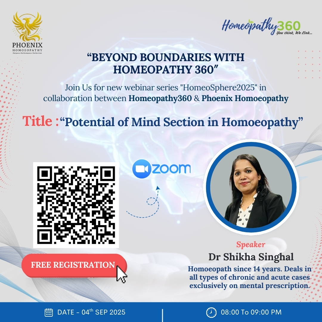 Join Upcoming webinar with Dr Shikha Singhal on Potential of Mind Section in Homoeopathy “BEYOND BOUNDARIES WITH HOMEOPATHY 360″Join Us for new webinar series “HomeoSphere2025” in collaboration between Homeopathy360 & Phoenix HomoeopathyTitle: “Potential of Mind Section in Homoeopathy“Speaker: Dr Shikha Singhal – “Homoeopath since 14 years. Deals in all types of chronic and acute cases exclusively on mental prescription.FREE REGISTRATION (Registration link): https://us06web.zoom.us/webinar/register/WN_skubbIeEQom1xrvKMjFH_gSession date: 04 September 2025Timings: 08.00 PM to 09.00 PM Moderator:Dr Mansi Tyagi – BHMS (SHMC, Delhi), DNHE, Marketing Head & Editor Homeopathy360About the Speaker: https://www.homeopathy360.com/dr-shikha-singhal-homeopath/ Click here to Registration Webinar Video Post Views: 4,108