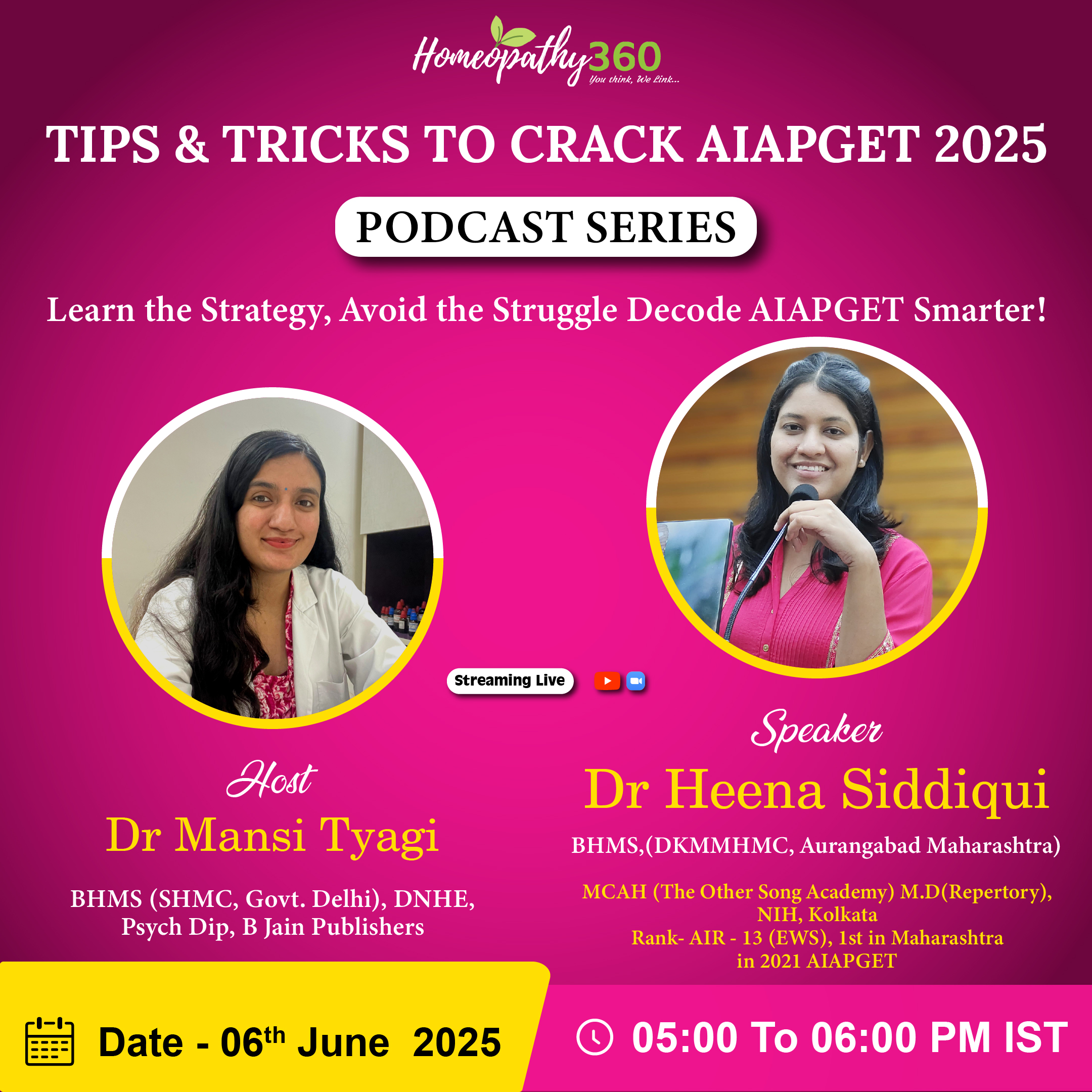 Join us for A PODCAST SERIES for TIPS & TRICKS TO CRACK AIAPGET 2025 with Dr Heena Siddiqui “BEYOND BOUNDARIES WITH HOMEOPATHY 360″Join us for A PODCAST SERIES for TIPS & TRICKS TO CRACK AIAPGET 2025 with Dr Heena SiddiquiTitle: TIPS & TRICKS TO CRACK AIAPGET 2025FREE REGISTRATION (Registration link): https://us06web.zoom.us/webinar/register/WN_Whch4LfwSNmXJvLgUmvvrwSpeaker: Dr Heena Siddiqui – BHMS,(DKMMHMC, Aurangabad Maharashtra)MCAH (The Other Song Academy), M.D (Repertory), NIH, Kolkata ,Rank – #AIR – 13 (EWS), 1st in Maharashtra in 2021 AIAPGETSession date: 6th June 2025Timings: 05:00 PM To 06:00 PM ISTModerator:Dr Mansi Tyagi – BHMS (SHMC, Delhi), DNHE, Marketing Head & Editor Homeopathy360Please join our community to get latest update and video this PODCAST:https://chat.whatsapp.com/ECxVjE3qLsx6VGTqCfkRv8 PODCAST Video Post Views: 3,364