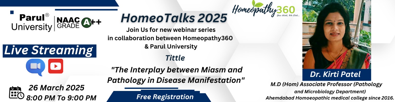 Join us for the upcoming webinar on “The Interplay between Miasm and Pathology in Disease Manifestation”  in the ‘Homeotalks 2025’ series, presented by Homeopathy360 in collaboration with Parul University.
