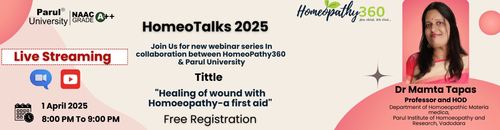 Join us for the upcoming webinar on “Healing of wound with Homoeopathy-a first aid” in the ‘Homeotalks 2025’ series, presented by Homeopathy360 in collaboration with Parul University.