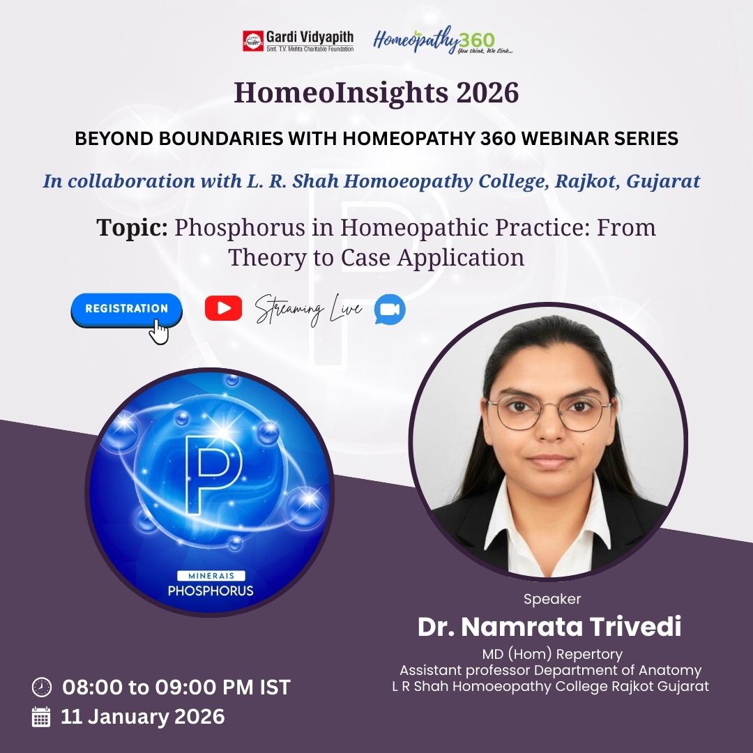 Join us for the upcoming webinar on “Phosphorus in Homeopathic Practice: From Theory to Case Application” in the ‘HomeoInsights 2026’ series, presented by Homeopathy360 in collaboration with L. R. Shah Homoeopathy College, Rajkot, Gujarat.