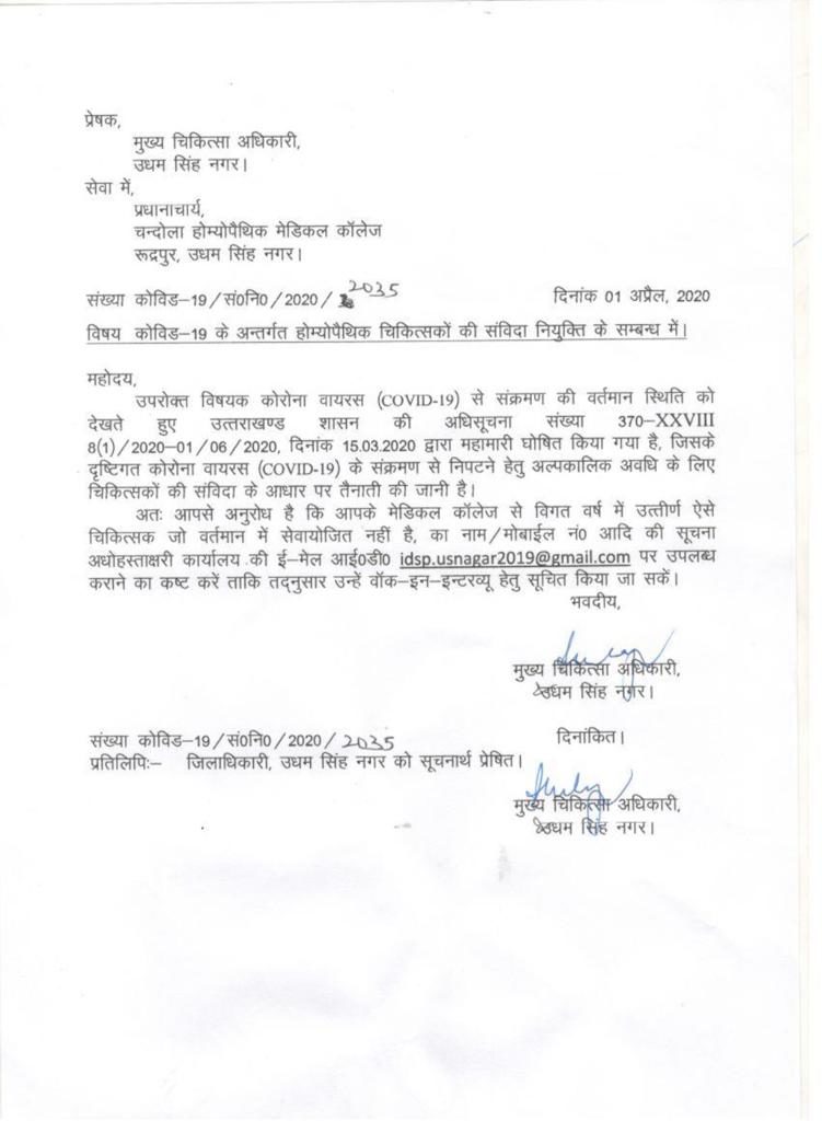 Letter To Chandola Homeopathic Medical College To Provide Details Of AYUSH Doctors For COVID-19 Management At Rudrapur Post Views: 987