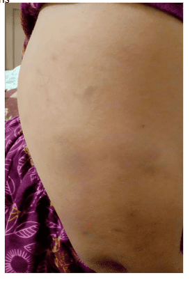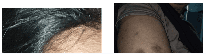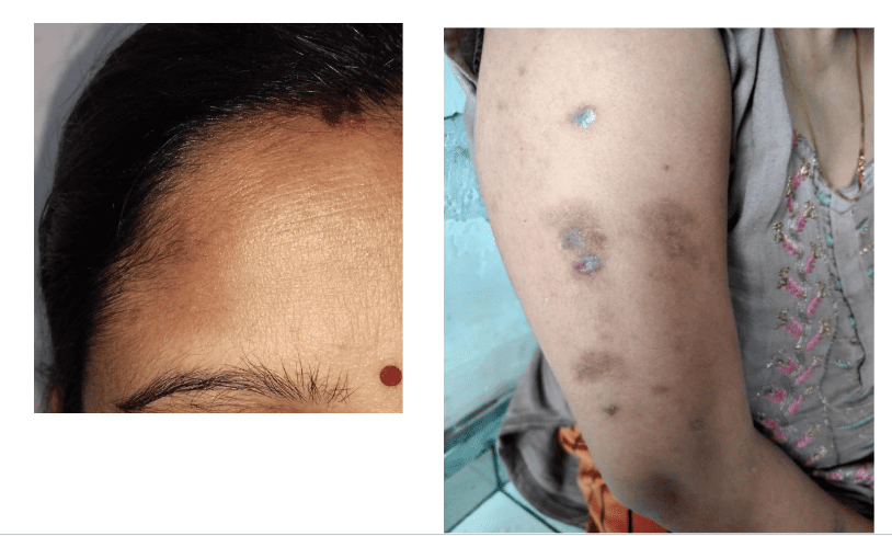 Dark, blackish, circular, flat-topped patches on forehead and arm(right side). Which itch slightly (not much), taking allopathic treatment for 1 year – ointment Beclomethasone, No any discharge from eruption. Itching < in summer, threading(?)