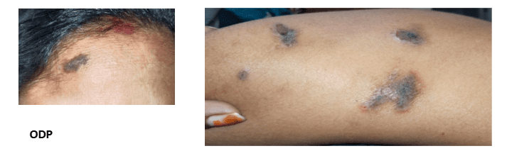 - Local examination – inspection of plaques on forehead and arm – dark, purplish and brownish, flat topped plaques, painless on palpation.