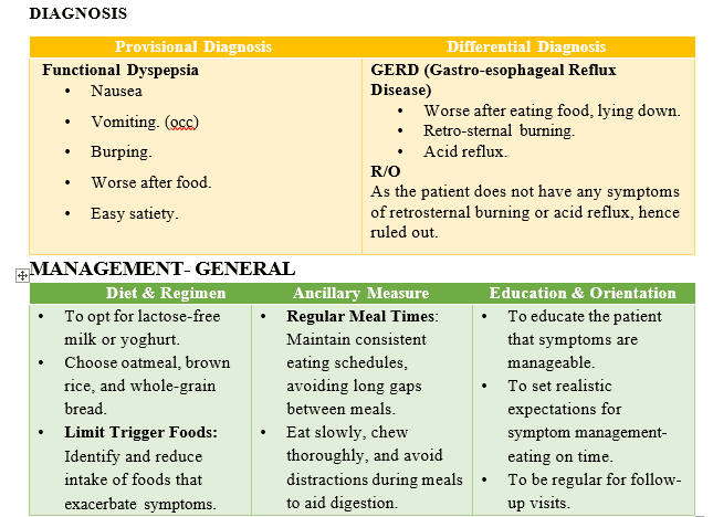 No specific laboratory or imaging investigations were undertaken in this case. The diagnosis of functional dyspepsia was made clinically, based on the characteristic symptomatology and the absence of alarming features such as weight loss, hematemesis, or melena. The case was evaluated according to the Rome IV clinical criteria.