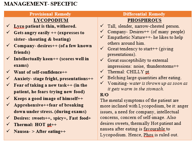 Lycopodium 200C was selected as the Constitutional Remedy and prescribed as a single dose, followed by a placebo. The selection was guided by Repertorization and Materia Medica analysis.