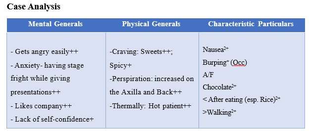 The patient gets angry easily and suppresses his anger generally in public with others, but at home, if he gets angry, he expresses his anger by mostly shouting and sometimes beating his younger sister, and he later feels remorse about his actions. He is a part of the NSS team in school, so he likes to lend a helping hand to those around him. He aspires to become a doctor in the future, and this has also made him create an interest in helping others. Before, the patient’s confidence was shaky, and he had a fear of presenting on stage as he feels very anxious while talking, but over time, he has improved his stage fears, but currently it is slightly present whenever he has to go up on stage. He is particular about how he presents himself to others in terms of his appearance, clothing and his hygiene, but he does not mind if things around him are not in order or clean. Currently, he feels scared to try new food as it might trigger his complaint, so he usually sticks to a bland diet on most days, and once or twice a week, he would have some flavourful and rich food items.
