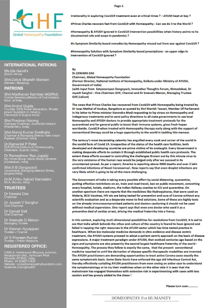The news that Prince Charles has recovered from Covid19 with Homeopathy being treated by Dr Issac Mathai of Soukya, Bangalore as quoted by Shri Manish Tewari, Member Of Parliament in his letter to Prime minister Narendra Modi requesting to lay stress on Homeopathy and indegenous treatments and to send policy directions to all state governments to use local Homeopathy and AYUSH doctors to provide appropriate treatment protocols for the quarantined and for general public to boost their immune systems, gives fresh hopes worldwide. Covid19 when treated with Homeopathy therapy early along with the support of conventional therapy could be a huge opportunity to the world in tackling this menace.