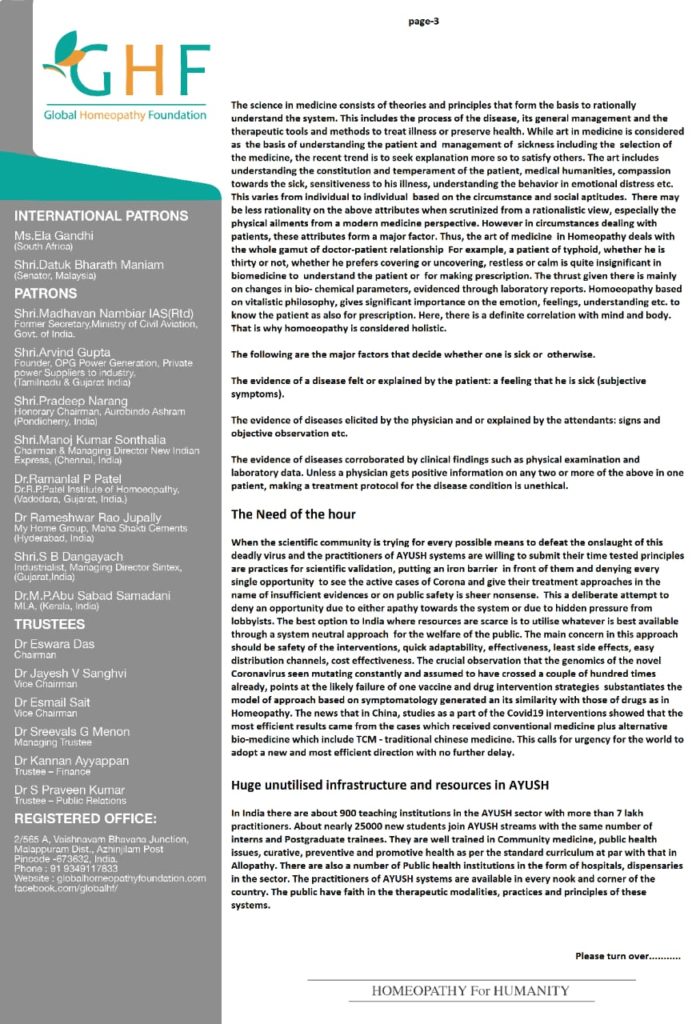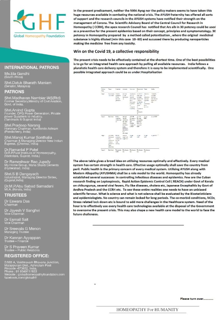 In India there are about 900 teaching institutions in the AYUSH sector with more than 7 lakh practitioners. About nearly 25000 new students join AYUSH streams with the same number of interns and Postgraduate trainees. They are well trained in Community medicine, public health issues, curative, preventive and promotive health as per the standard curriculum at par with that in Allopathy. There are also a number of Public health institutions in the form of hospitals, dispensaries in the sector. The practitioners of AYUSH systems are available in every nook and corner of the country. The public have faith in the therapeutic modalities, practices and principles of these systems. In the present predicament, neither the Nithi Ayog nor the policy makers seems to have taken this huge resources available in combating the national crisis. The AYUSH fraternity has offered all sorts of support and the research councils in the AYUSH systems have notified their strength on the management of Corona. The Scientific Advisory Board of the Central Council for Research in Homeopathy ( CCRH), the apex research Council has notified that Ars alb in 30 potency could be used as a preventive for the present epidemics based on their concept, principles and symptomatology. 30 potency in Homeopathy prepared by a method called potentisation , where the original medicinal substance is highly diluted (min this case 10– 60) and sucussed there by producing nanoparticles making the medicine free from any toxicity.