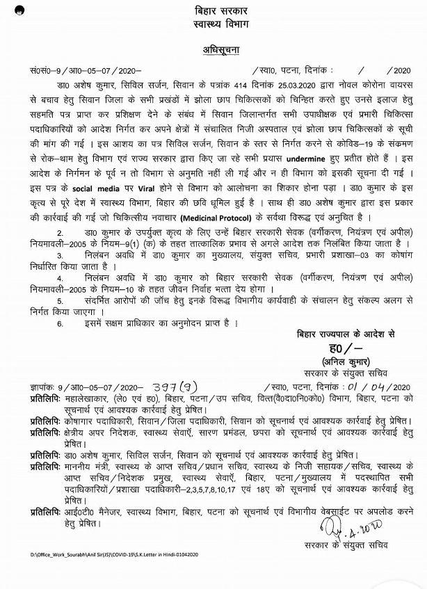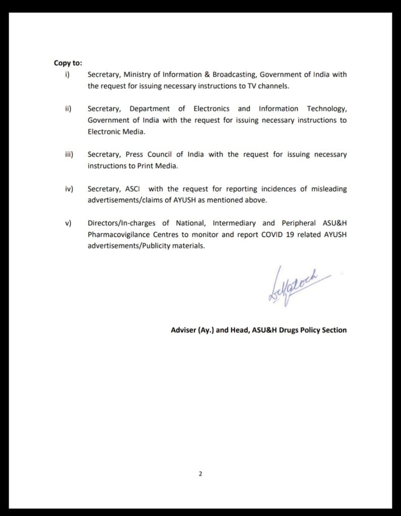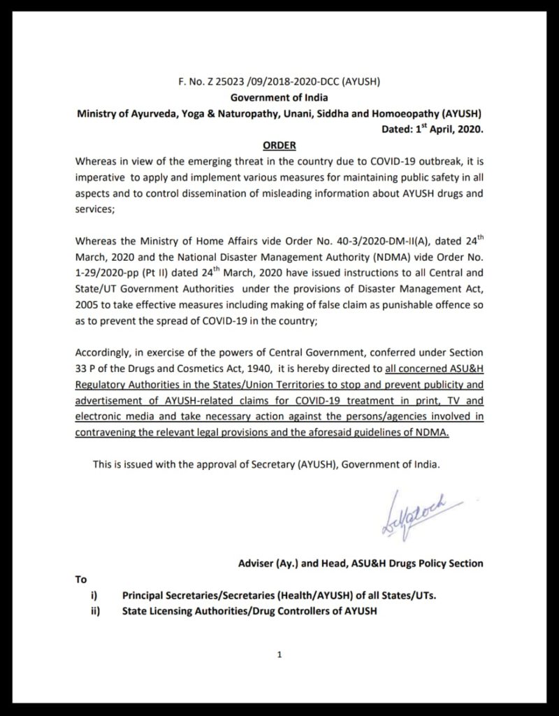 Order By Ministry Of AYUSH To Stop Publicity And Advertisement Of AYUSH Related Claims For COVID-19 Treatment Post Views: 1,120