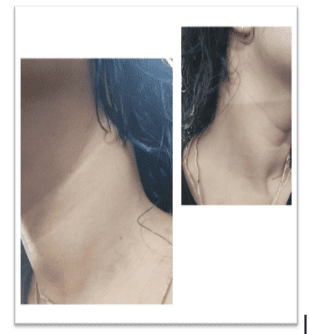 The patient reported gradual onset of whitish patches around the neck, spreading slowly to the chest. The lesions were mildly itchy and worsened after perspiration. No history of systemic illness.