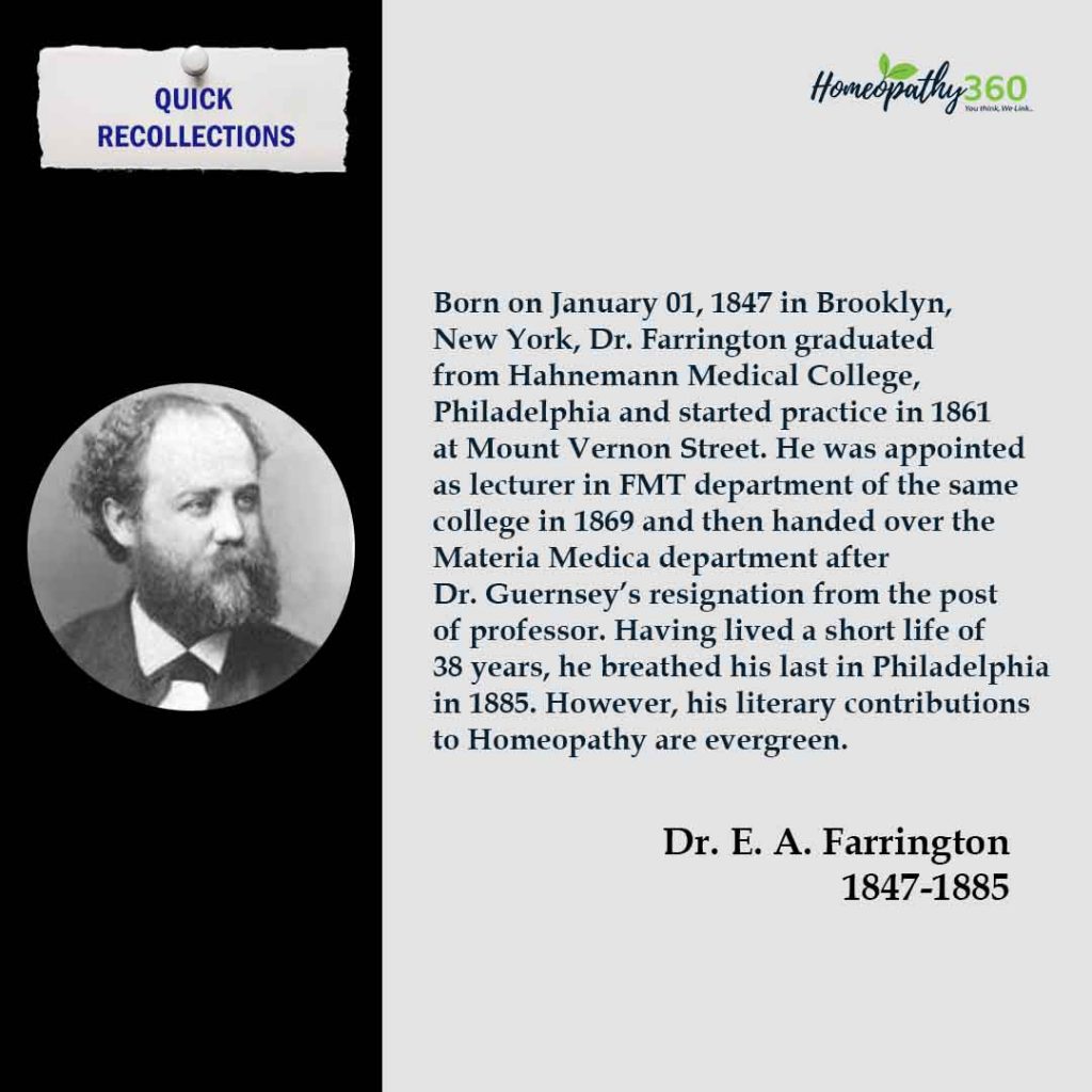The subject of this sketch, Dr. Ernest A. Farrington, was born January 1, 1847, at Williamsburg, Long Island, N. Y., and died at Philadelphia, December 17, 1885. During his early years his family removed to Philadelphia, at which place he received his education, and rapidly rose to eminence in his profession.