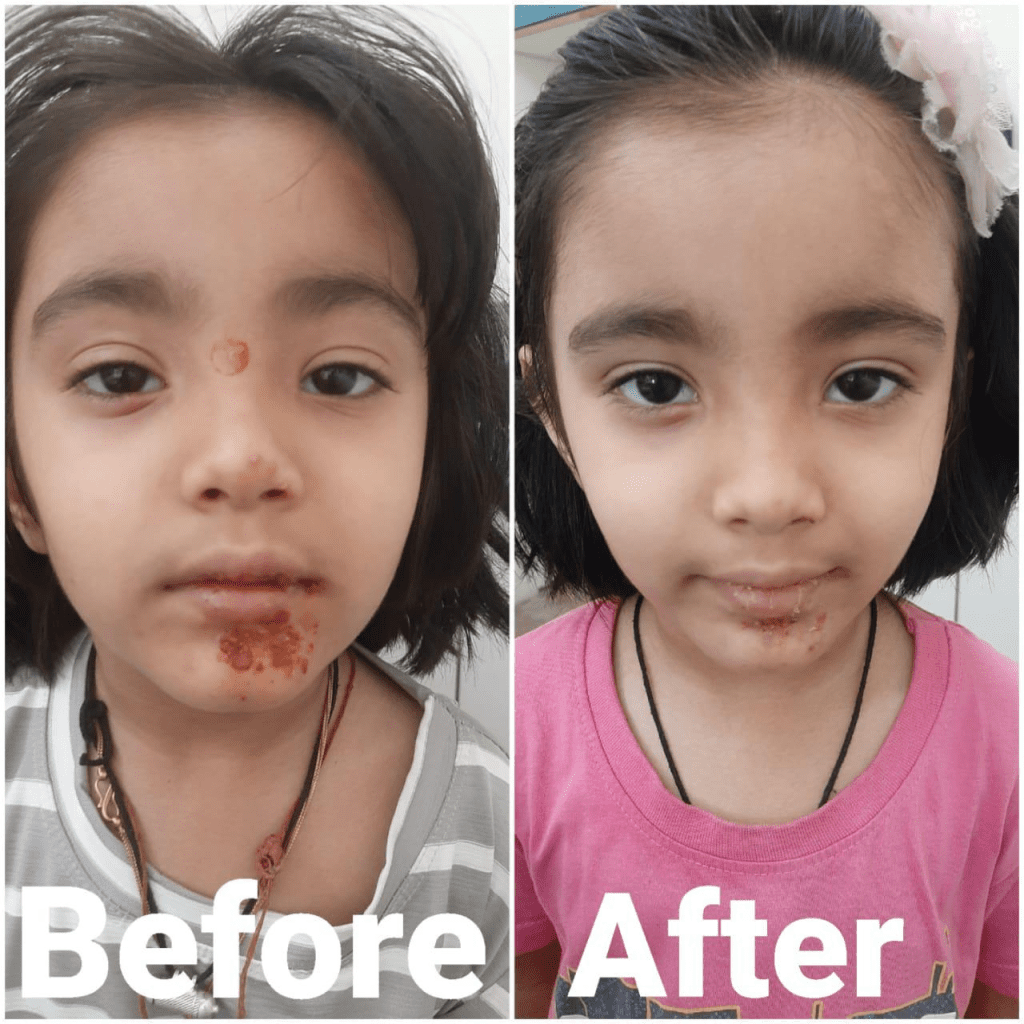 - Before: The child shows clear skin lesions, but possibly mild internal discomfort or irritability.