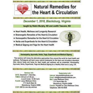 Natural Remedies for the Heart & Circulation Saturday, December 1, 2018 Blacksburg, Virginia Topics covered will be: ★ Heart Health, Wellness and Longevity Research...