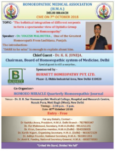 CME by Homoeopathic Medical Association (HMA) – Delhi Branch on 7th Oct 18 at Dr. B. R. Sur Homoeopathic medical college, hospital and research centre,...