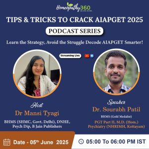 “BEYOND BOUNDARIES WITH HOMEOPATHY 360″ Join us for A PODCAST SERIES for TIPS & TRICKS TO CRACK AIAPGET 2025 with Dr Sourabh Patil Title: TIPS &...