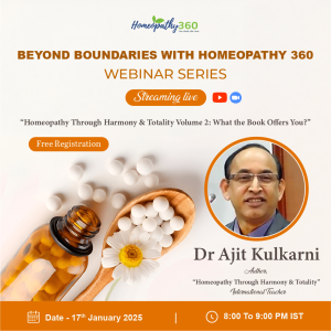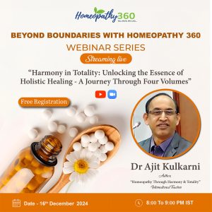 “BEYOND BOUNDARIES WITH HOMEOPATHY 360 Join us for an enriching live webinar with Dr Ajit Kulkarni on Harmony in Totality: Unlocking the Essence of Holistic...