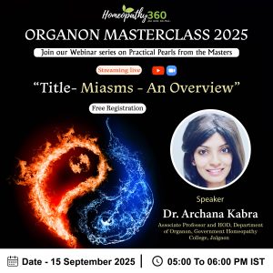 ORGANON MASTERCLASS 2025: A Revolutionary Learning Series by Homeopathy360 Join us for an enriching live webinar with Dr Archana Kabra on “Miasms – An overview” Title: “Miasms –...