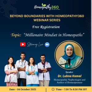 “BEYOND BOUNDARIES WITH HOMEOPATHY 360″ Join us for an enriching live webinar with Dr Lubna Kamal  on “Millionaire Mindset in Homeopaths” Title: “Millionaire Mindset in...