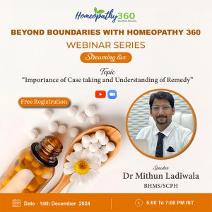 “BEYOND BOUNDARIES WITH HOMEOPATHY 360 Join us for an enriching live webinar with Dr Mithun Ladiwala on Importance of Case taking and Understanding of Remedy Title:...