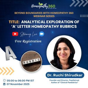 “BEYOND BOUNDARIES WITH HOMEOPATHY 360″ Join us for an enriching live webinar with Dr. Ruchi Shirudkar on “Analytical Exploration of ‘A’ Letter Homeopathy Rubrics” Title: “Analytical Exploration...