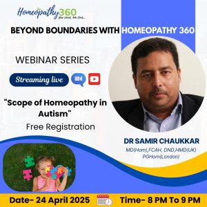 “BEYOND BOUNDARIES WITH HOMEOPATHY 360” Join us for an enriching live webinar with Dr Samir Chaukkar on “Scope of Homeopathy in Autism “ Title: “Scope...